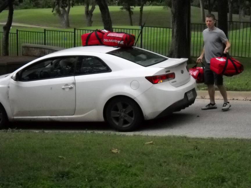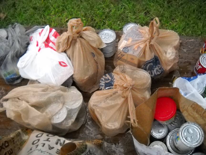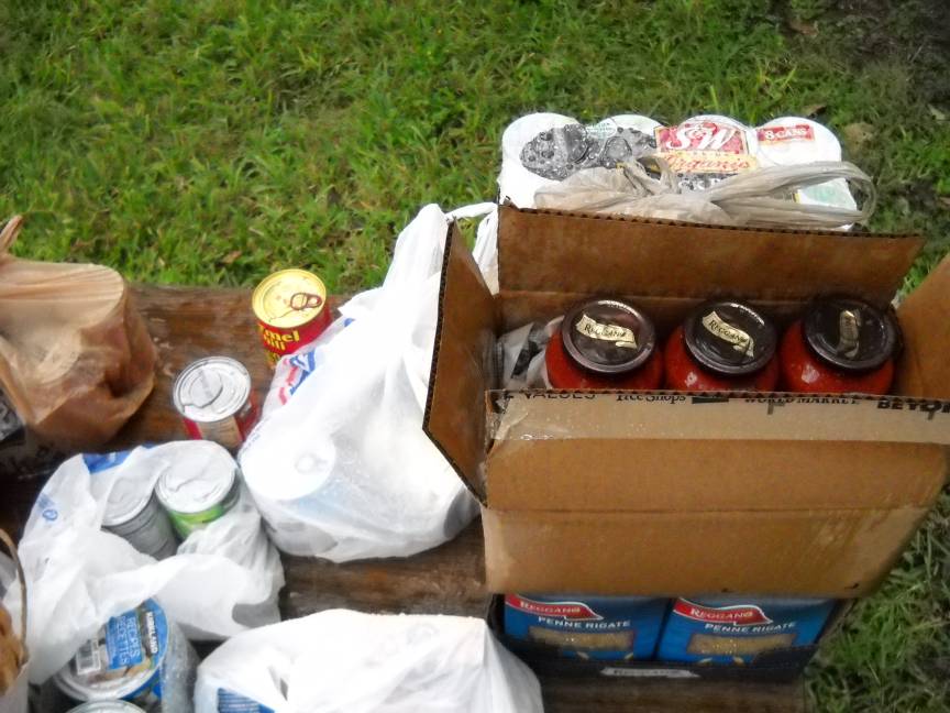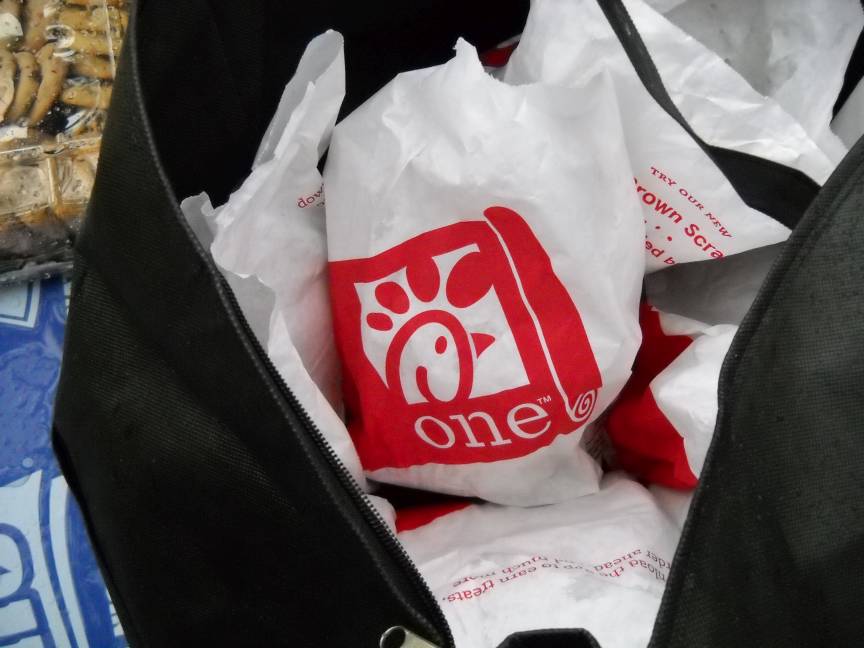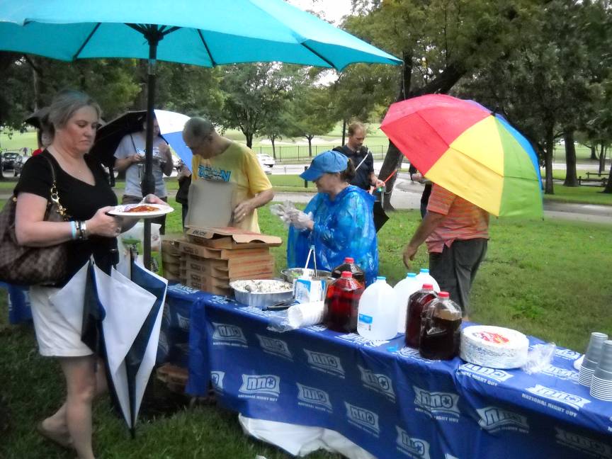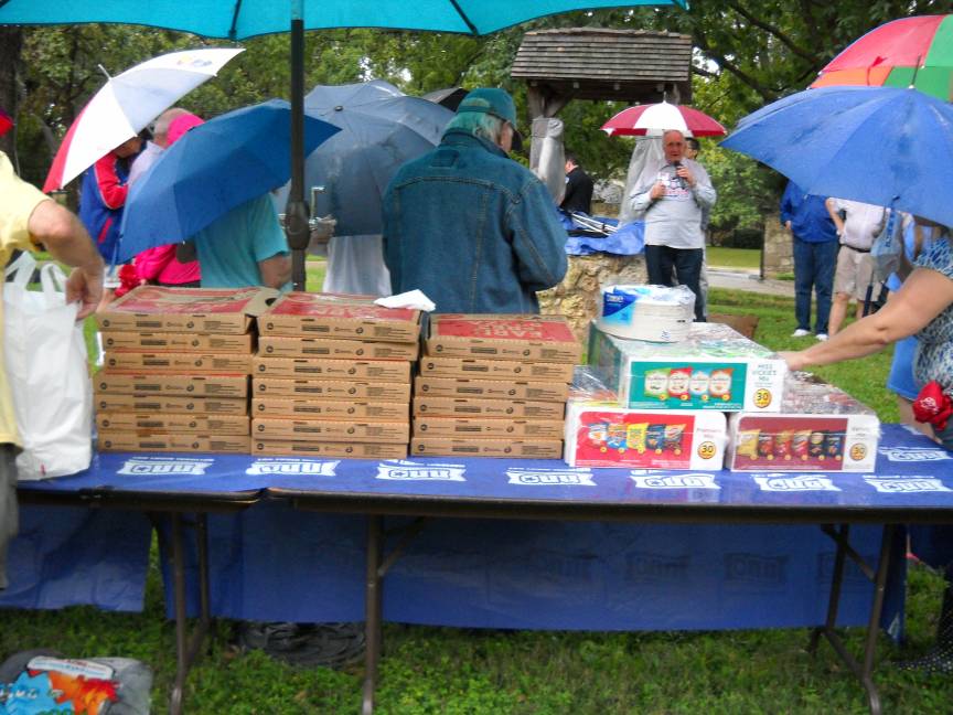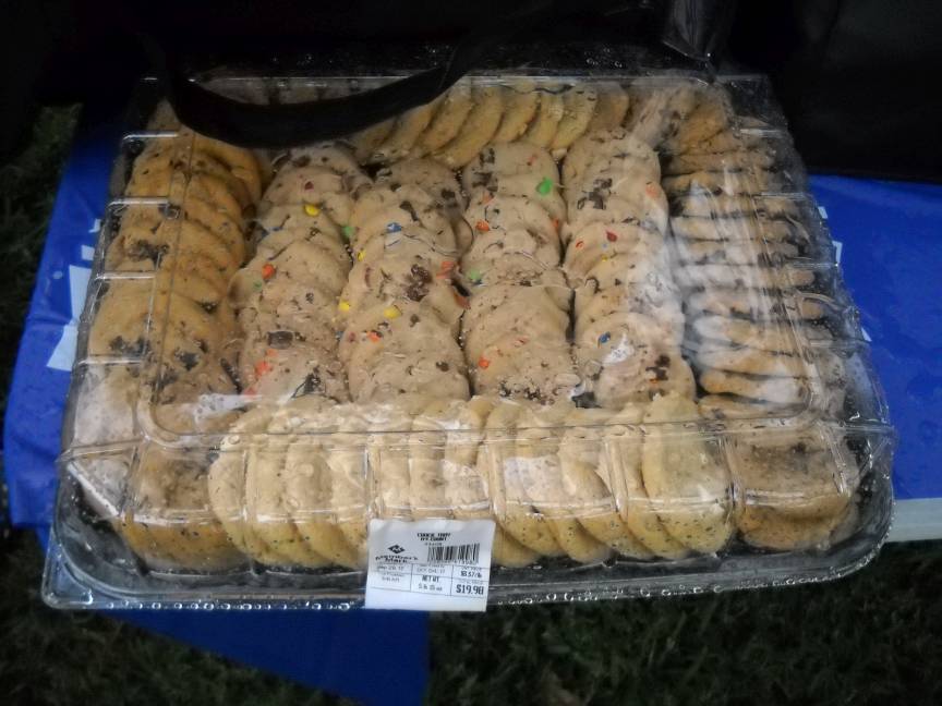 Chick-fil-A chicken sandwiches, Pizza Hut Pizza, salad, tea, water, and cookies were served to the hungry neighbors.