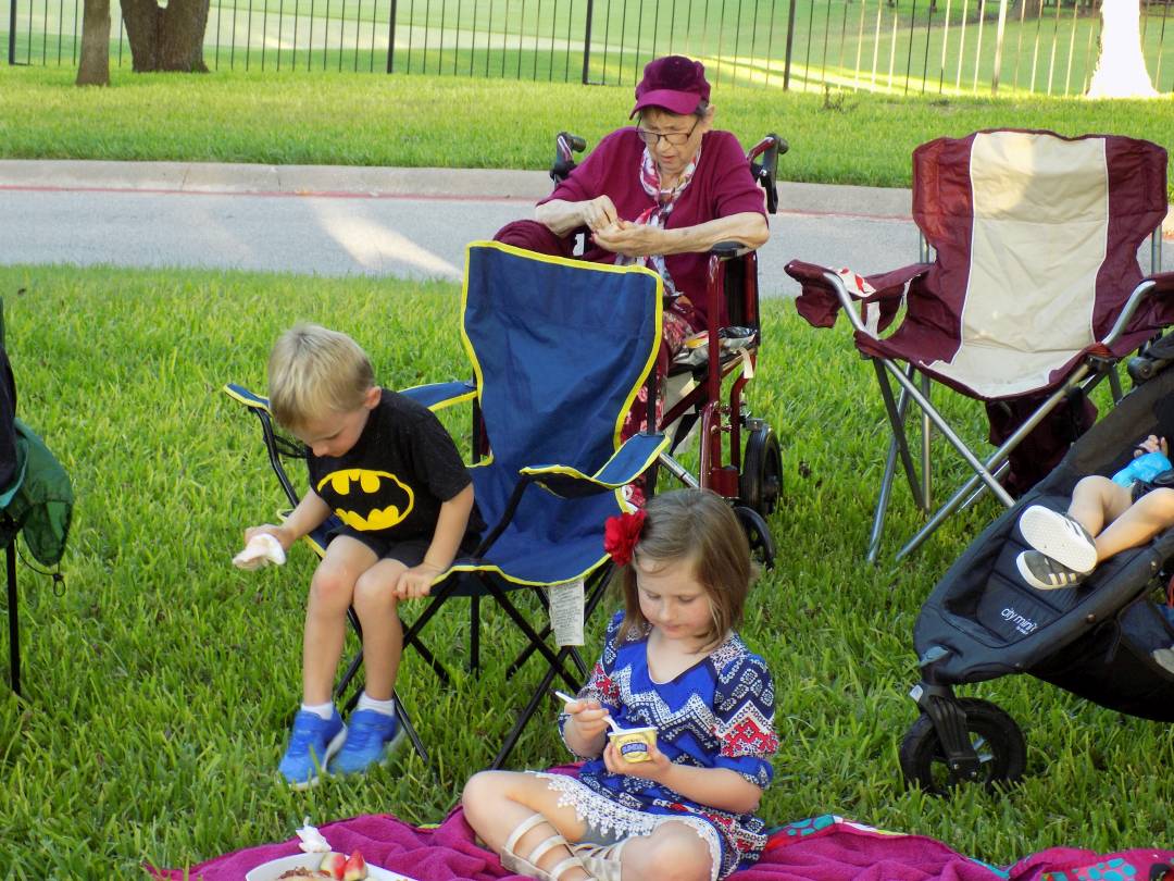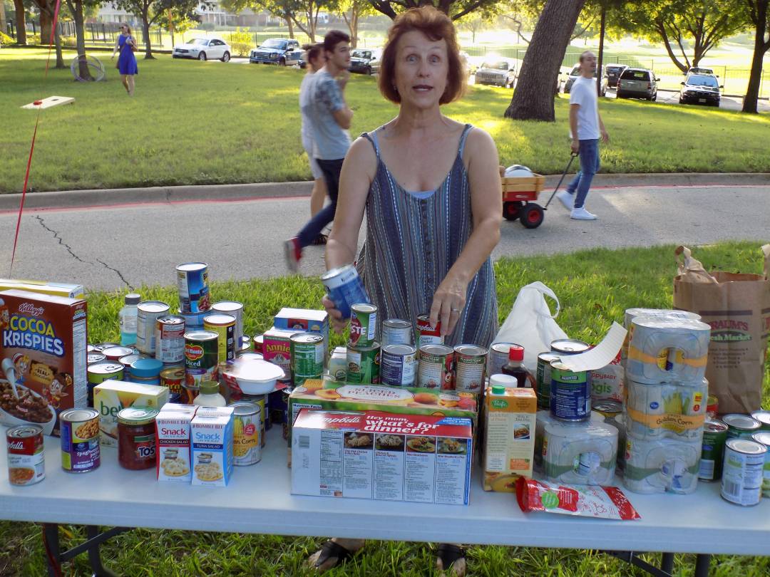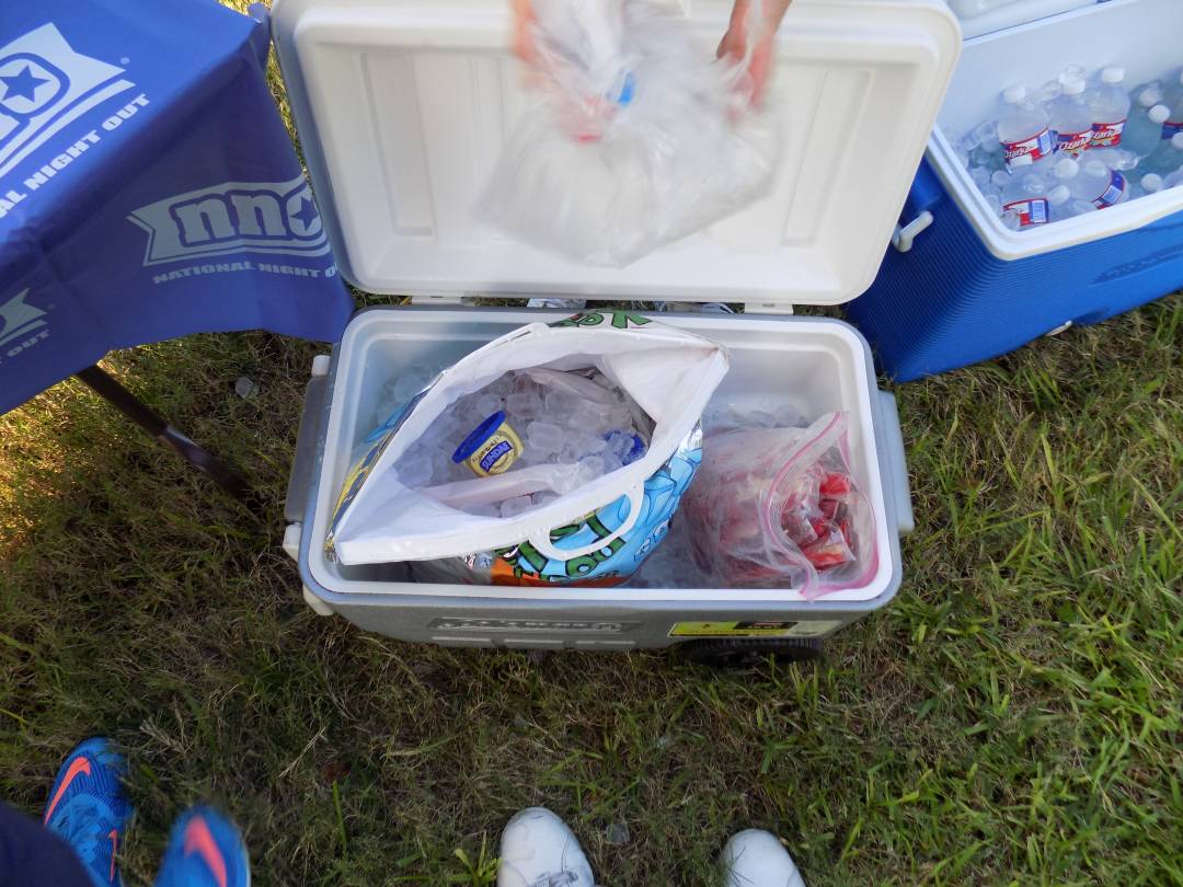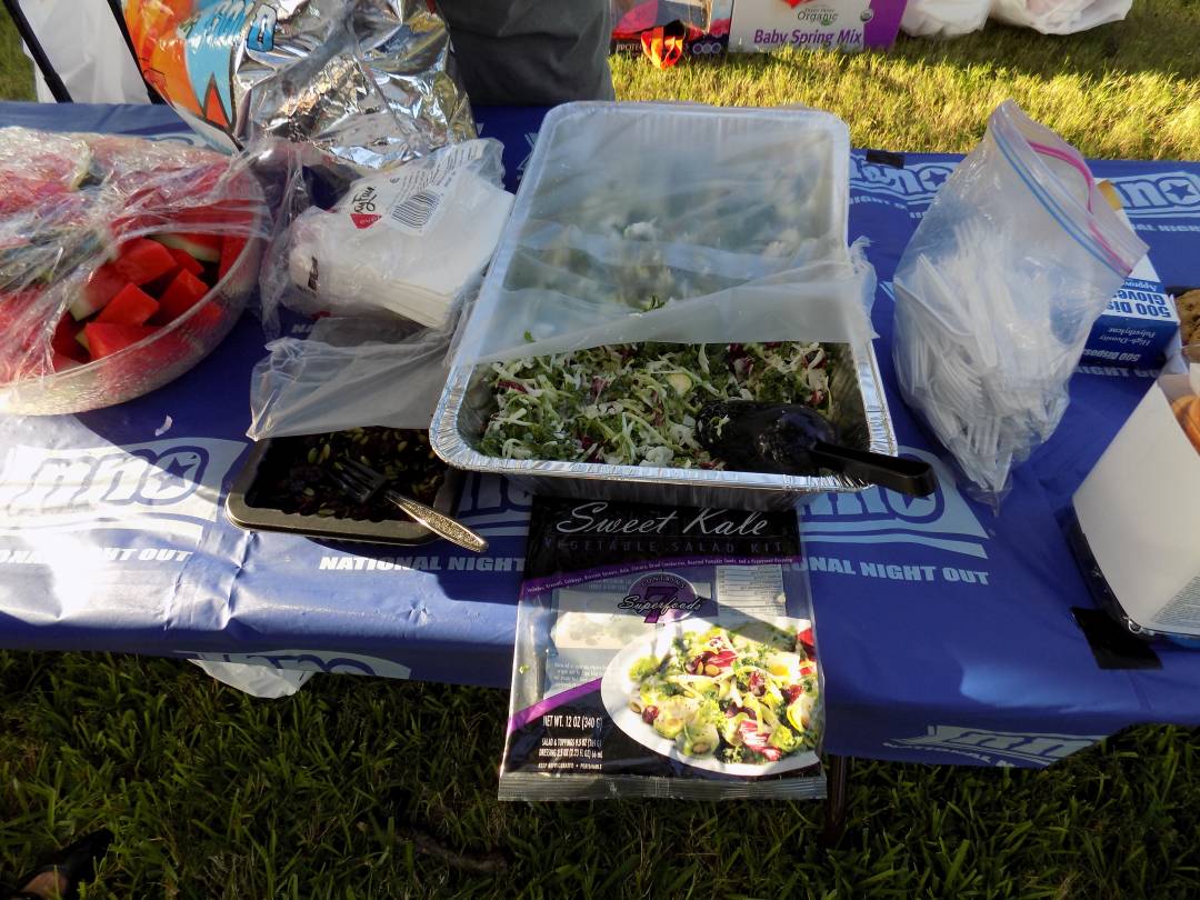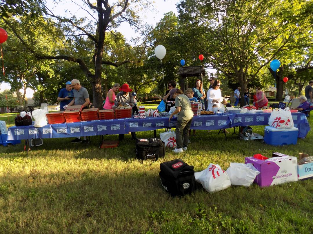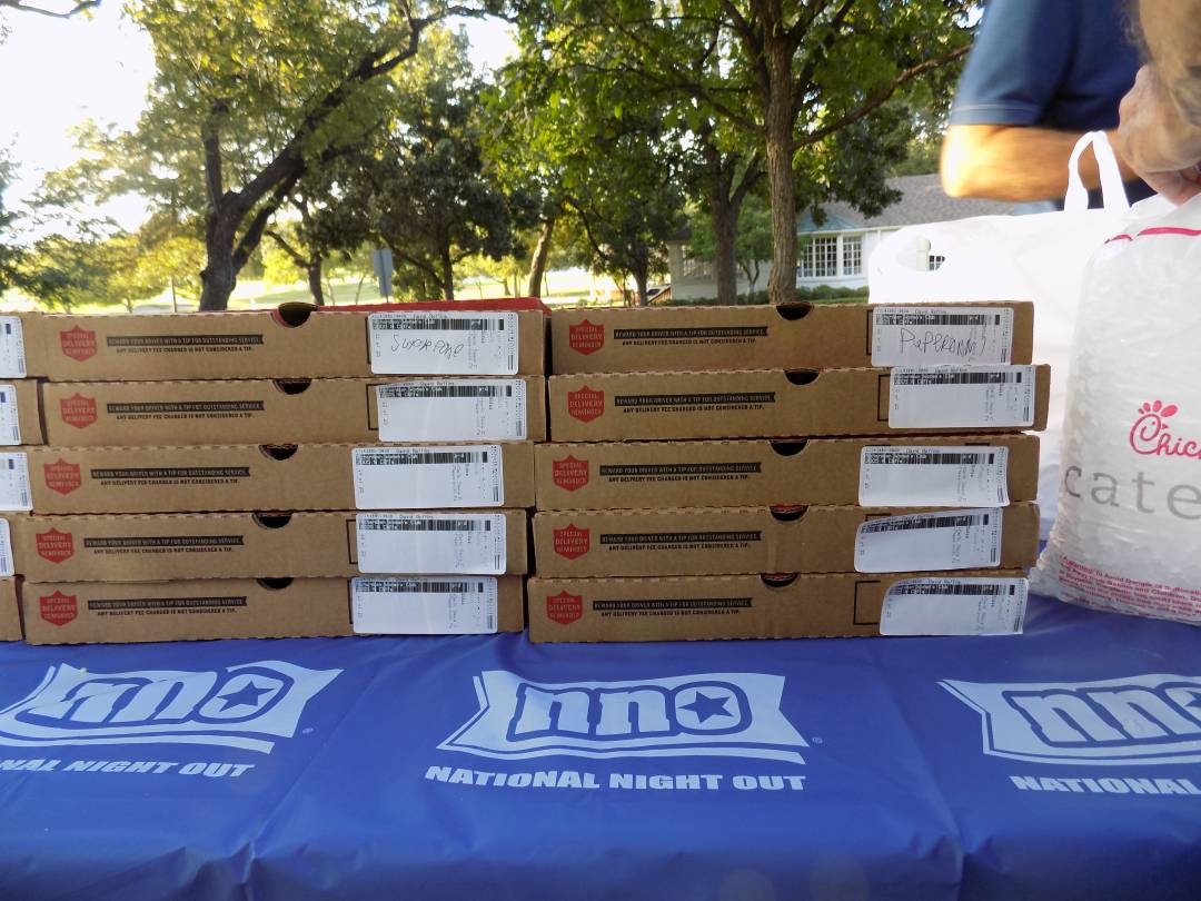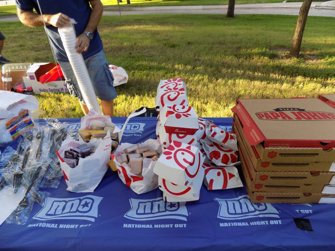Chick-fil-A chicken sandwiches,Papa Johns Pizza, salad, tea, water, chips cookies, popsicles, and ice cream were served to the hungry neighbors.