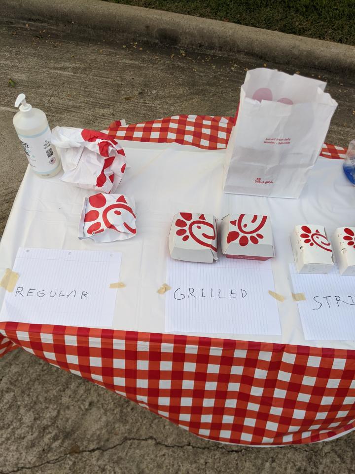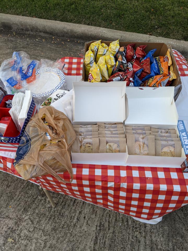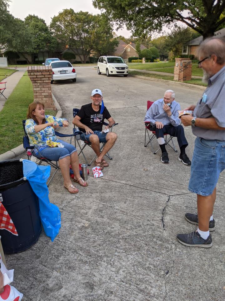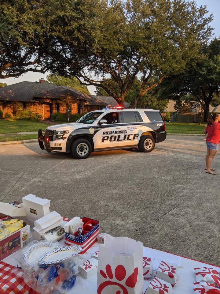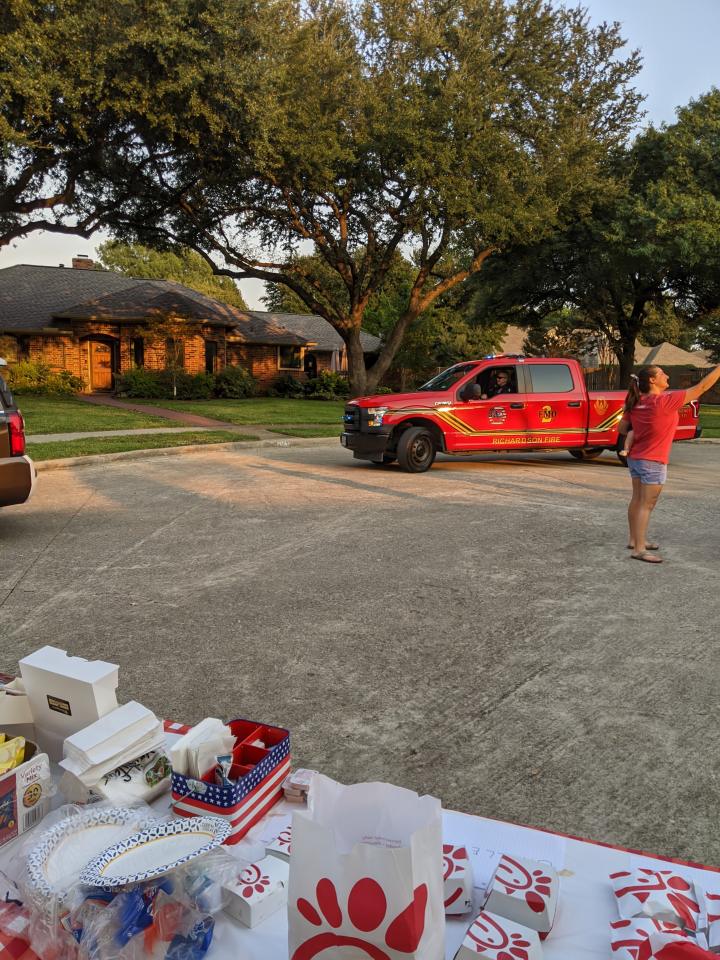 Briarwick Ct. held an outing with Chic-fil-a sandwiches, chips, cookies, and water. The City gave us a drive through parade of several police and fire vehicles. Thanks to the Johnston's, Roffino's, and the Lightfoot's.