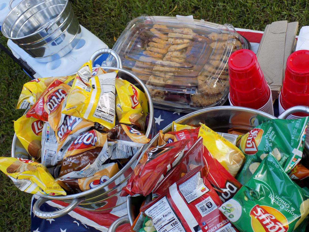 Chick-fil-A chicken sandwiches, Pizza Hut Pizza, salad, tea, water, chips, and cookies were served to the hungry neighbors.